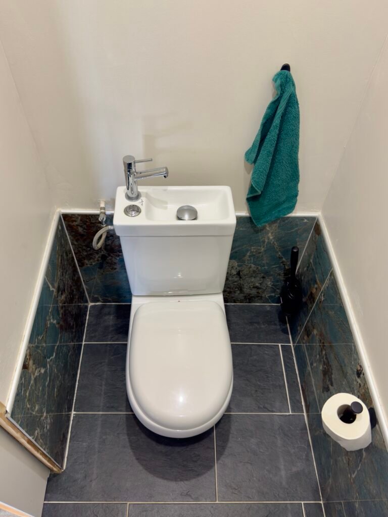 Salle de bain lumineuse avec une douche à l’italienne, une vasque et un wc.
